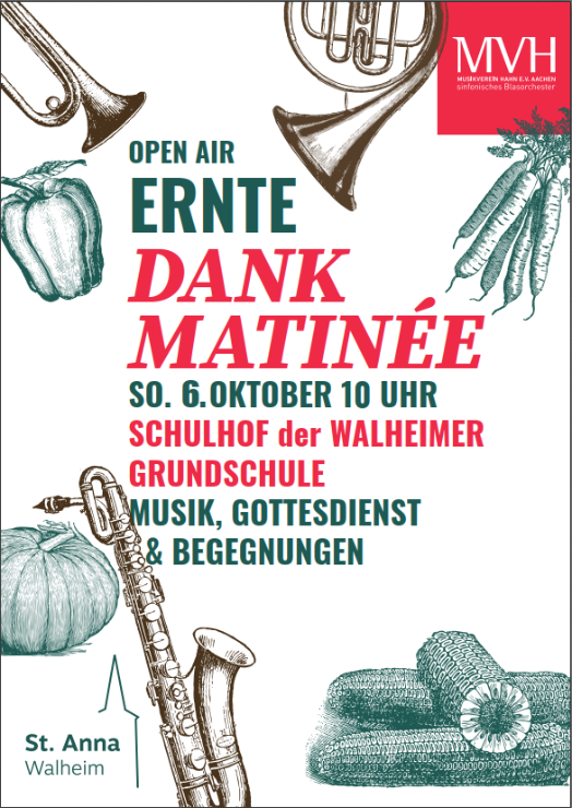 Um 10.00 Uhr laden wir auf den Schulhof der Walheimer Grundschule zur Erntedankmatinee, einer Wortgottesfeier, musikalisch mitgestaltet vom Musikverein Hahn, ein.